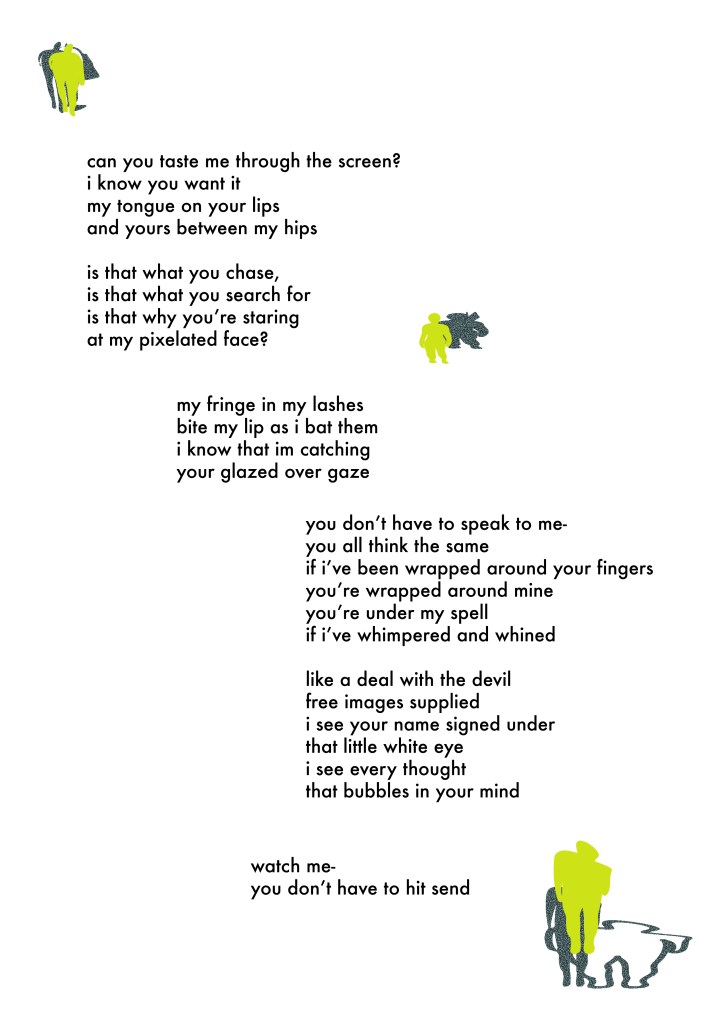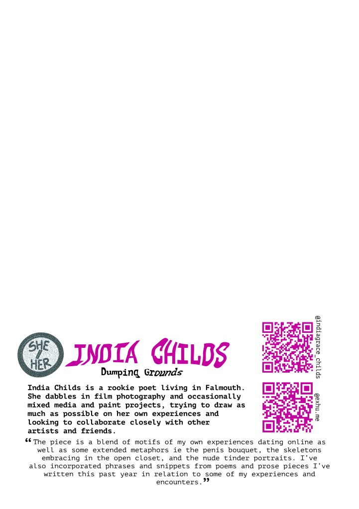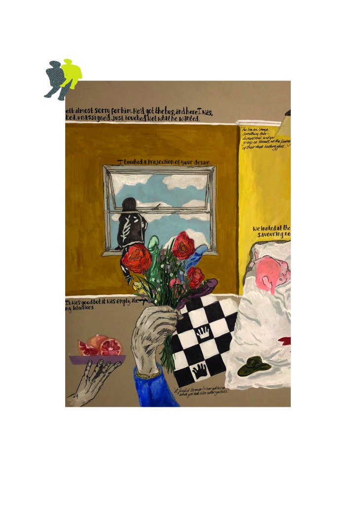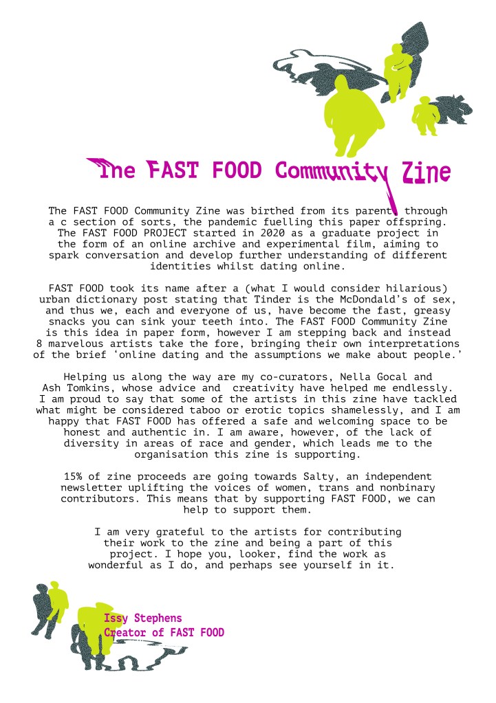 Working with a range of talented artists, writers and curators, The FAST FOOD Community Zine expands from FAST FOOD, Issy’s graduate film project. The zine features 8 works which explore the artists experiences of online dating. 15% of the proceeds went to SALTY.