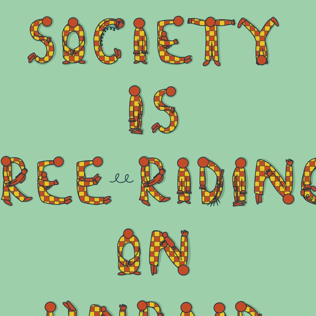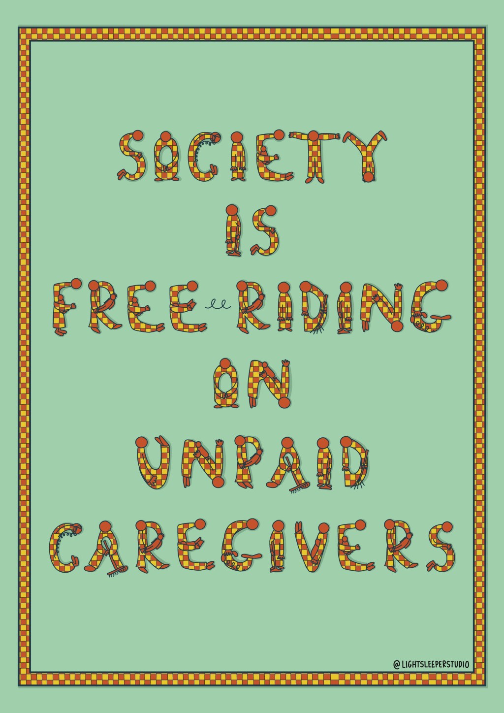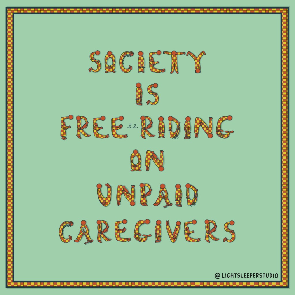 The slogan ‘Society is free-riding on unpaid caregivers’ was one that came to mind whilst researching about caregiving, gender and capitalism. This research inspired the illustration, where I created letters out of characters doing reproductive labour.